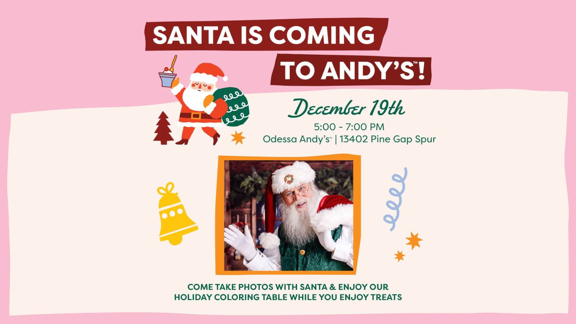 Santa is making a sweet stop at Andy’s in Odessa, and you’re invited! Join us on December 19th from 5:00–7:00 PM at 13402 Pine Gap Spur for a festive evening with photos with Santa, delicious treats, and a holiday coloring table for the kids. Bring the whole family, snap some magical holiday photos, and enjoy your favorite Andy’s treats while you’re here. We can’t wait to celebrate the season with you!