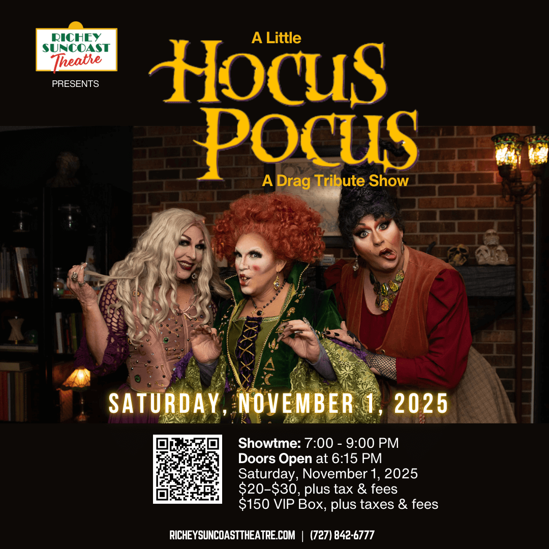 Die Hexen sind zurück und bringen etwas Magie aus ihrer Heimatstadt mit! Begleiten Sie die Tampa Bay Sanderson Sisters – drei beliebte lokale Drag-Ikonen, die hier in New Port Richey und der Tampa Bay Area aufgewachsen sind und ihre Karriere aufgebaut haben – zu einer schillernden Hommage an Disneys Hocus Pocus und Hocus Pocus 2.