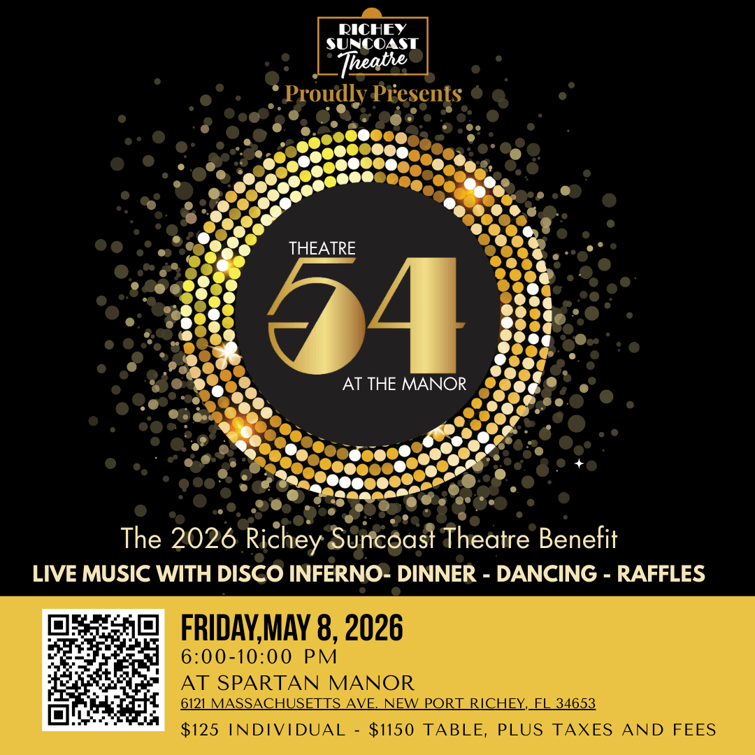 The iconic style and sparkle of Theatre 54 is coming to Pasco County for one night only. Join us at Spartan Manor for an immersive 70s throwback experience to support the Richey Suncoast Theatre, a 501(c)3 non-profit community arts organization.