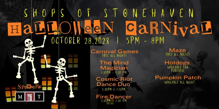 De winkels van Stonehaven (5500 Main Street) vieren hun derde jaarlijkse Halloween Carnaval! Kom naar buiten voor een avond vol veilig Halloweenplezier, georganiseerd door uw lokale winkels. KOSTUUMS WORDEN AANGEMOEDIGD! Alle kinderen moeten worden begeleid door een volwassene. Winkeleigenaren aanvaarden geen verantwoordelijkheid.